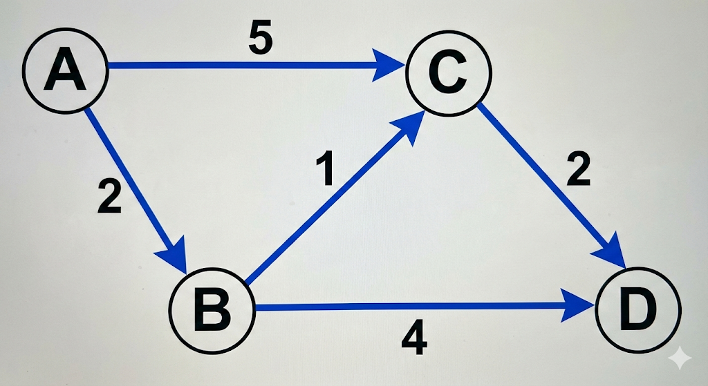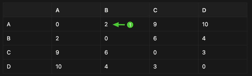 From B, nearest unvisited city is D (distance 4) (note that we can’t return to A now, so we have to move to the next nearest point which is D)