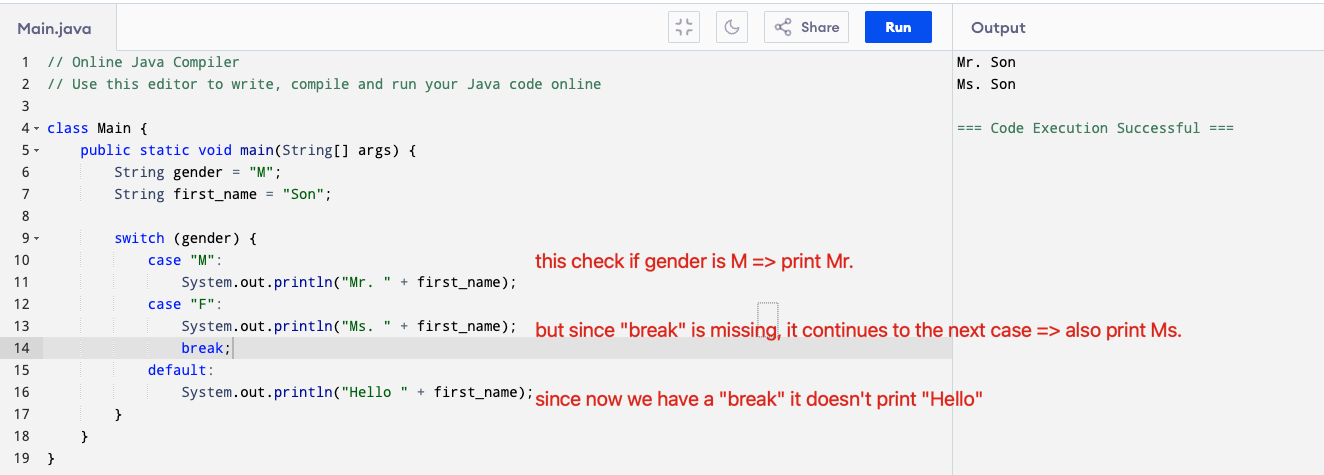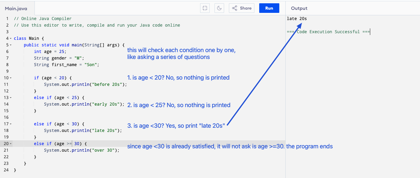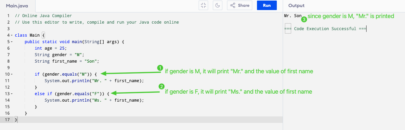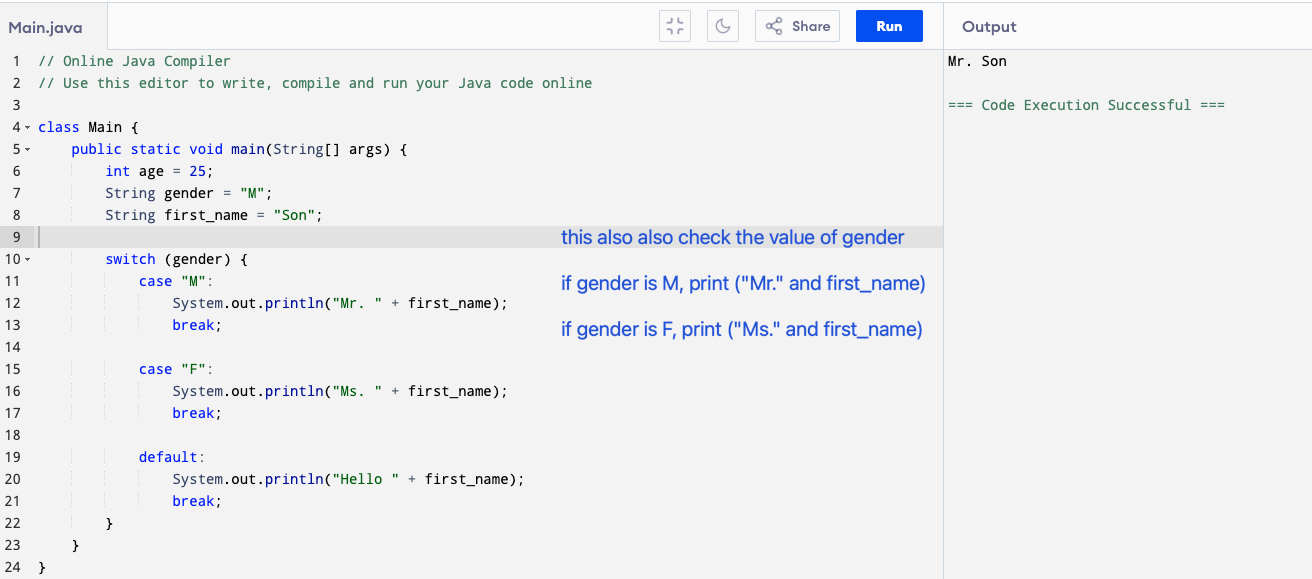 (The eagle eyes among you might notice I’m not following Java convention of naming things, in which I should name the variable firstName. first_name is actually Python convention, which is what I’m more used to).