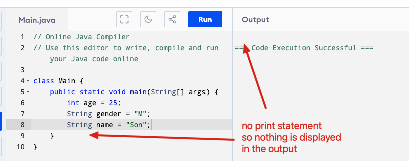 Statically typed: Java requires you to specify what kind of data you’re using. That’s why you see keywords like int, double, or String before a variable name. These are called data types.
